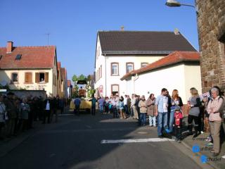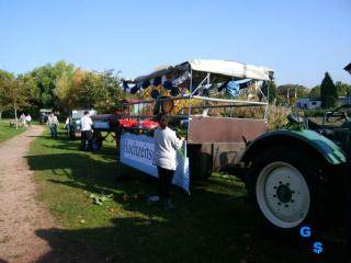 Nach kurzer Zeit ging es dann in die Startaufstellung, da traf man dann auch andere Oldtimerfreunde, in der Szene kennt man sich eben. Was mit metallischen Geräuschen und mürrischen Gedanken begann sollte dennoch belohnt werden. Für kleine Zwischeneinlagen (Kreise und Achter) des kleinen Holders gab es reichlich Applaus und eindeutige Handbewegungen die eine Wiederholung verlangten. Hartmut führte seinen Planwagen mit, es hatten sich Mitfahrer angesagt die dann leider nicht erschienen. So ein leerer Planwagen hat offensichtlich auch sein Reiz, er war schnell mit einer lustigen Gesellschaft besetzt, herrlich solche Momente, wie die sich freuten. Kurzum es war eine gelungener Festzug, die lange Fahrt hat sich gelohnt. Nun war es Zeit für die Heimfahrt die sich mit max 14 km/h endlos hinzieht. Beim Einbruch der Dunkelheit war dann die Halle in Alsheim wieder erreicht, Hartmut war schon vorausgefahren um bei Problemen mit dem angezählten Holder besser helfen zu können. Die weitere Rückfahrt mit dem Holder B12 erfolgte ohne Probleme, am nächsten Tag zeigte es sich..... ..... es war nur eine lockere Keilriemenscheibe und hätte schnell erledigt werden können. Aber es war auch so ein toller Tag, und das Publikum zeigte uns, wir sind auf dem richtigen Weg |