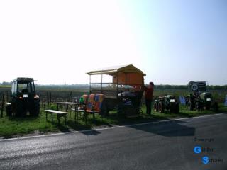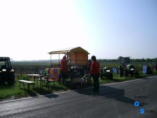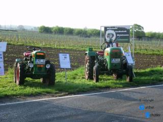 Es sollte relativ viel zeigen und wenig Aufbauzeit in Anspruch nehmen....... logistische Unterstützung bekamen wir vom Weingut Schauf. Einfach nur Schlepper hinstellen ist nicht unser Ding, es muß schon etwas sein was ankommt, da es sich dabei ja auch nicht um Publikum aus der Szene handelt. Wir entschieden uns für 3 Schlepper, das Schefenacker Sprühgerät, die machen uns am wenigsten Arbeit, da ist alles vorbereitet. Der Plananhänger von Hartmut gehört zu den Fahrzeugen die in der Vergangenheit überall in der Gemarkung zu sehen waren. Sie waren Transporter und Unterstand bei Regen, eben das was jetzt von den Kleinbussen übernommen wird. Der darf auf keinen Fall fehlen. Was etwas problematischer war, war der Anhänger mit den Mölsheimer Maschinen, da sind Erklärungen notwendig. Hartmut bearbeitete die einzelnen Maschinen sehr genau, für jede Maschine hatte er eine kurze aber stimmige Erklärung parat. Über den Zustand von Anhänger und Maschinen vertrauten wir auf den Kontakt zu den Besuchern. Der Farymann Motor mit seiner unbekannten Vergangenheit sollte auch nicht fehlen. So ganz nebenbei sollte auch ein Hufeisenwerfen zur Unterhaltung beitragen. Es kam dann doch etwas anders als geplant, wir waren in viele tolle Gespräche vertieft und überliessen den Mädels das Hufeisenwerfen. Dabei geht ein ganz großer DANK an Sarah die nicht nur an der Hufeisenkampfbahn zugange war sondern auch noch die Urkunden ausstellte und Preise ausgab. |