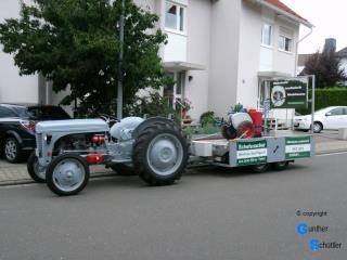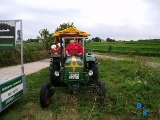 So zogen wir unsere Bahn durch den Ort, viele bekannte Gesichter und nette Begegnungen. Der Ferguson zog munter seine Bahn, viele wussten von ihm aber keiner hatte ihn vorher gesehen, ein wunderbares Gefühl... ....dabei ging die Schefenacker Spritze aus Wachenheim echt unter..... Vom 2. Wagen gab es Bonbons für die Kinder und Leckerli für die Hunde. Auch gab die Malteserhündin Tina in ihrem roten T-Shirt Vorführungen. Nach dem Ende des Zuges ging es dann über den Mühlbrunnen auf den Heimweg. Kurz nach Mölsheim noch eine kleine Rast mit allerlei Köstlichkeiten und dem Blick über das schöne Tal..... Die Kerb ging weiter und wir traten den Heimweg an. |