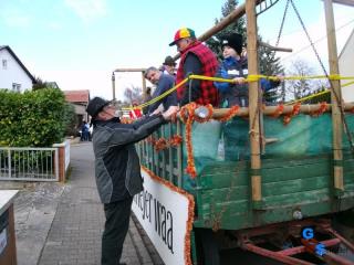 ......bei dem Vergnügen soll ja keiner zu Schaden kommen. So lädt der Zugmarschall Hermann alljährlich zur Besprechung für den Zug, Sicherheit hat Priorität, das Vergnügen der Zuschauer ist ein sehr wichtiges Anliegen. Die Art wie er da vorgeht ist schon ein besonderes Erlebnis. In diesem Jahr fuhr man da auf die Jugend ab, da lagen wir mit dem Jugendprojekt "Wilde Emma" ja goldrichtig. Zu dem frühen Zeitpunkt gab es noch keine Startfreigabe, aber wir dürfen die Wilde Emma notfalls mit einem Schlepper ziehen. Ganz wichtig, ein Motto muß her....... .....ja wie wärs denn mit ...mer esse kaan Honisch, mer kaue Biene.... Nach dem Motto wurden dann Ideen. Es wurde gewerkelt und genäht, es sollte ein kleiner Wagen werden der unsere Identität auch in der närrischen Zeit zeigt. Das ist mit dem Wagen mit Martin (oder Martina) dann auch voll gelungen.