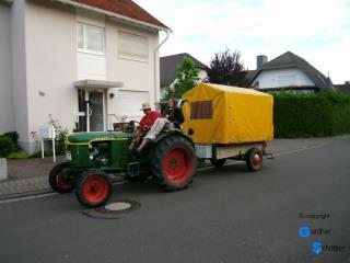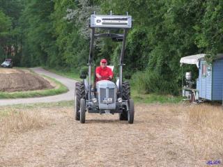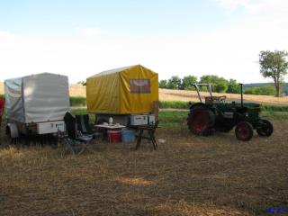 Zeutern war nicht für eine solche, das Jahr prägende, Tour vorgesehen, nein nach Zeutern wollten wir mit dem Auto. Aber es gibt da auch spontane Änderungen, die Großen Feldtage sind etwas ganz Besonderes, warum dann nicht auch die Fahrt mit dem Traktor. So starteten wir, Hartmut, Gunther und unsere jüngste Aktive Sarah, am 2. August in der Frühe (07:30) und erreichten gegen 14:00 Uhr Zeutern. Die Fahrt ging über Worms, Lampertheim durch die Randbezirke der Universitätsstadt Mannheim unserem Ziel entgegen. Wir sahen viele Menschen die uns zuwinkten und beim Blick auf das Nummernschild noch eins zulegten. Es war eine super Fahrt mit einer etwas größeren Pause. Schöne abwechslungsreiche Landschaften waren der Lohn für diese Entscheidung. Gerade rechtzeitig erreichte wir das Festgelände, da begann dann auch schon ein heftiger Regen den wir im Festzelt erlebten. Bis nach Zeutern benutzten wir ein Navigationsgerät, sinnvolles Vorgehen erleichterte uns dabei die Fahrt. Den Rest des Samstags und den ganzen Sonntag verbrachten wir auf dem Festgelände in Zeutern. Die Großen Feldtage Zeutern sind nun mal sehenswert. Die Nächte verbrachten wir in unseren Planwagen im Fahrerlager.