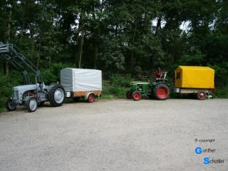 Hartmut übernahm die Führung, erst mit Zetteln und dann griff seine Ortskenntnis. Mit zunehmender Fahrtstrecke wurden die Reaktionen auf unsere Nummernschilder und unser Logo am Frontlader immer markanter. So erreichten wir unser Ziel Heimerdingen. Zuerst stellten wir die Beiden Traktoren mit Anhänger auf einem Supermarkt Parkplatz ab, wir wollten ja noch einige km Richtung Heimat zurücklegen, auch dies kam anders. Wir gaben Sarah (standesgemäß mit den Traktoren) bei ihrer Oma für die Ferien ab, auf der Rückfahrt wird sie uns fehlen. Nach einem guten Essen, Kaffee und Kuchen wollten wir aufbrechen aber es zog Regen auf. So verschoben wir unsere Weiterfahrt auf Dienstag früh. Die Traktoren fuhren wir noch auf einen benachbarten Hof und ließen uns von der Oma verwöhnen. Für die Rückfahrt wählten wir die alte Strecke bis Zeutern, die war ja auch wirklich schön. Ab Zeutern ließen wir wieder das Navi arbeiten, unsere Vorgabe war die Fahrt geht diesmal über Heidelberg. Nun machte diese moderne Technik doch noch einige Probleme, erst kein Ton und dann einen Fatal Error und das in der Stadt. Aber auch das konnte uns nicht aufhalten, die Stadt, die Bahn und unsere alten Traktoren, einfach ein Genuss. Die weitere Fahrt ging dann über Weinheim Lampertheim und Worms. Nach der Rheinbrücke waren wir wieder zurück in Rheinhessen. Noch ein kurzer Tankstopp und dann verlangten wir den Maschinen nochmal einiges ab um möglichst schnell wieder in Guntersblum anzukommen. Ja die Rückfahrt ging auf die Knochen, über zehn Stunden ohne wirkliche Pause....... ....wir hätten noch ein Tag anhängen sollen. |