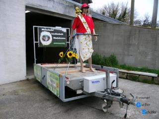 Das Motto war schnell gefunden: ....mer esse kaan Honisch, mer kaue Biene.... Außer dem Motto gab es auch Rahmenbedingungen, der Wagen sollte auch für die anderen Festzüge 2014 tauglich sein, und außerdem hatten wir uns da schon für die Solo Motorsense entschieden. Diese ist jedoch nicht so einfach zu verstehen, so schafften wir uns eine Schaufensterpuppe an um die Handhabung zu verdeutlichen. Zu diesem Zeitpunkt waren dann Alle mit der Gestaltung des Wagens beschäftigt. Es wurde geschraubt, bestellt und genäht..... ....Wurfmaterial organisiert und mit Bedacht ausgewählt was wir noch kaufen mussten Es sollte ja ein durchgängigen Sinn ergeben.