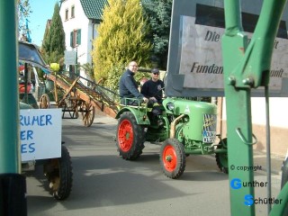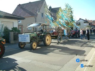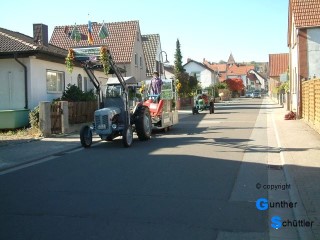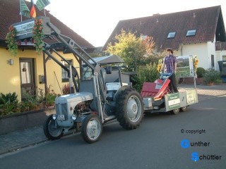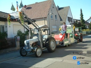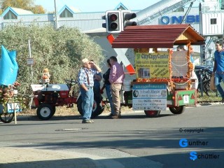 Nach und nach füllte sich die Straße, es gab nette Bekanntschaften und auch Erinnerungen an die Jugendzeit. Als es dann endlich losging stellten wir uns auf einen Festzug ein wie wir den in Bockenheim schon oft erlebt hatten. Weit gefehlt, es gab Ablaus auf der ganzen Strecke, das war neu. So fuhren wir mit der Startnummer 50 den Weg entlang, es gab viele Kontakte, fremde Menschen kamen auf ein Schwätzchen zu uns an die Schlepper. Wie üblich waren auch wieder viele Bekannte zu sehen. Besonders am Tor der Deutschen Weinstraße ging es sehr eng zu, da war die Sicherheit auch wichtiger als jeder Bekannte der Anspruch auf unsere Aufmerksamkeit hatte. So ging ein wunderbarer Festzug zu ende, ja ein Festzug wie wir ihn noch nie erlebt hatten. Schönes Wetter und ein wunderbares Publikum waren die wichtigsten Zutaten. Langsam ging es dann wieder zurück und als alle Maschinen in den Garagen und Hallen zurück waren trafen wir uns zum Abschluß in der Rheinperle in Rheindürkheim. |