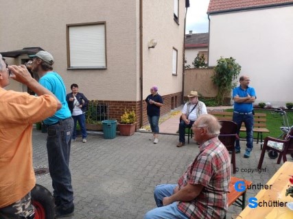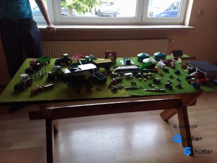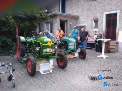 überdachter Platz. Ja wir sind da ja verwöhnt von den vergangenen Veranstaltungen mit den Freunden vom DRK.... ....da muß dann eben was mehr her wie ein Grill, Grillgut und Sitzgelegenheiten. Der erste Blick fiel auf den Deutz F1L612 und den Kramer KL11, zwei ungleiche Brüder aber das gleiche Herz (Motor). Ja auch ein tolles Wiedersehen nach langer Zeit, ja es gab nur Arbeitsbesuche und Telefon. Kaffee und Kuchen reichlich, bis dann die Aufforderung kam, "Geht doch mal da rein". Ja da war eine sehenswerte Ausstellung von Modellen aufgebaut, Andreas und Bruno hatten sich da für uns heftig ins Zeug gelegt. Beim Grillen ging es wieder zu wie in alten Zeiten, richtig schön, die lange Trennung hat also keine negativen Spuren hinterlassen. Ja es wurde spät und jeder packte beim Aufräumen mit an, wie es sich gehört. Zum Schluß noch unseren Dank an Andreas und seine Eltern für die Unterstützung und an Marco für die Organisation.