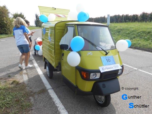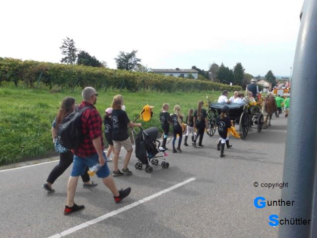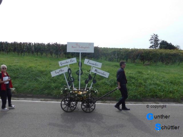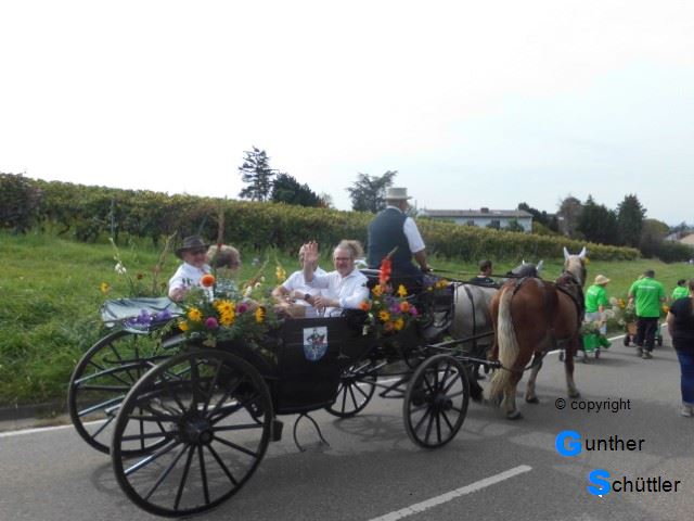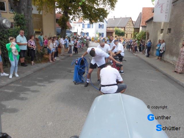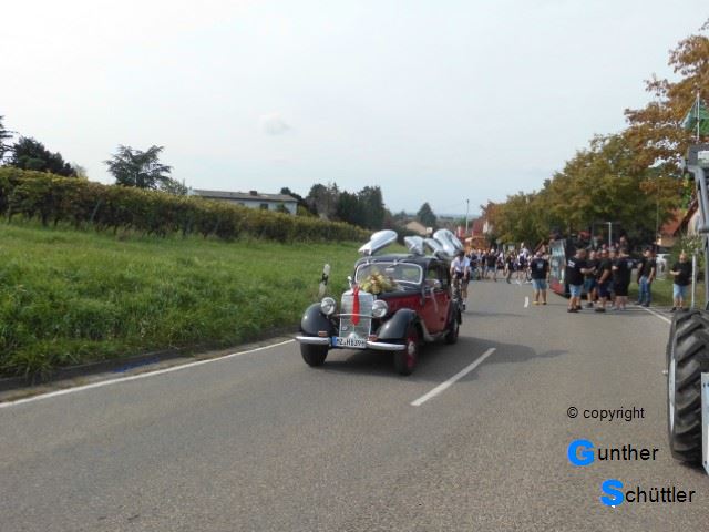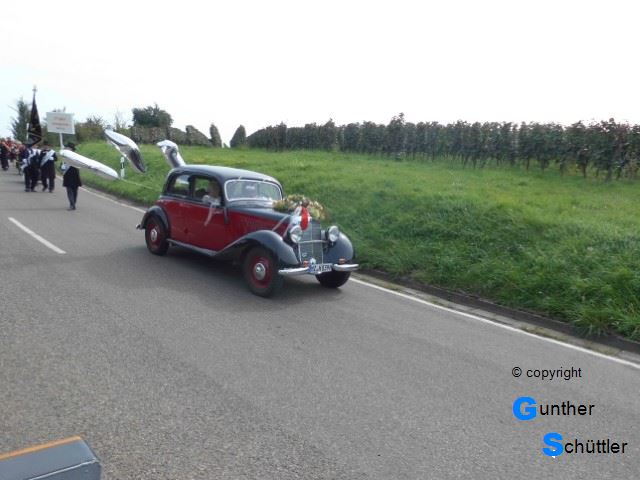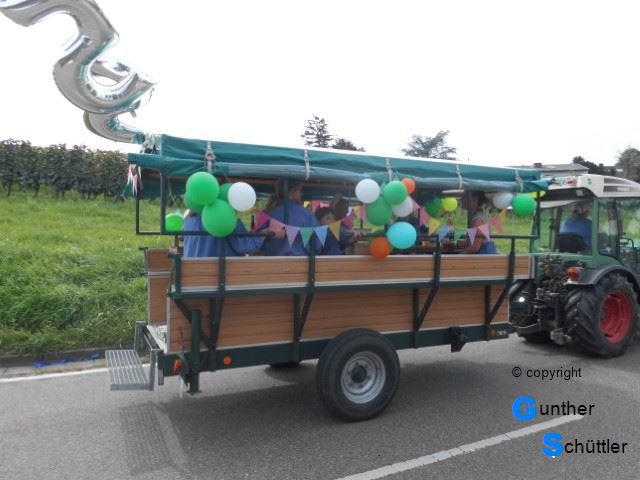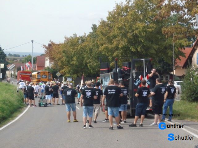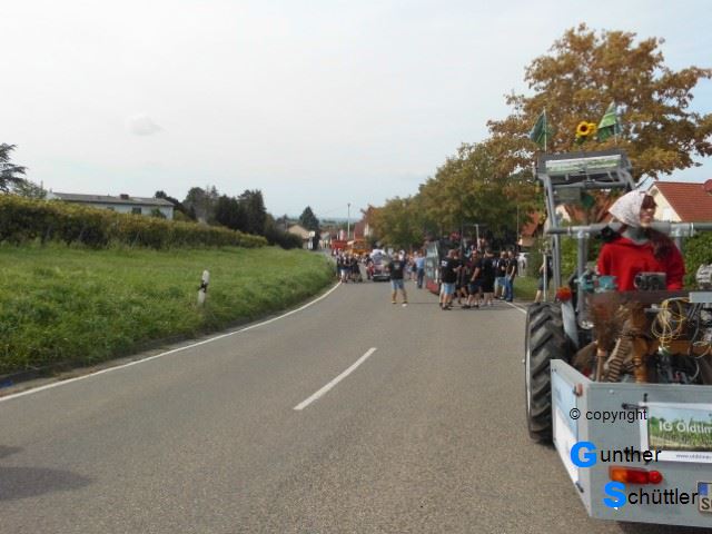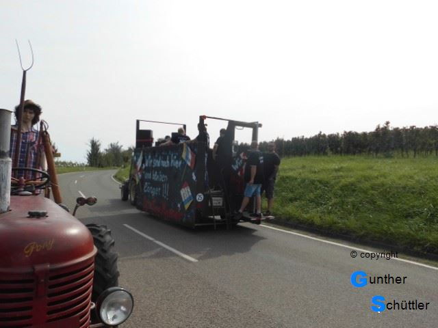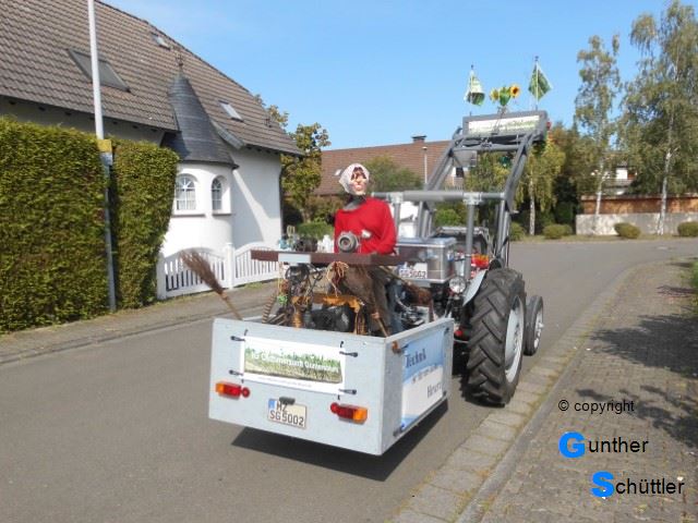 Im Amtsblatt war zu lesen: "75 Joor, mer fange dann mol merkwerdisch kla o" Die Merkwerdische feiern also Kerb mit einem Umzug, ist ja ganz in der Nähe, da könnten wir doch mal wieder mitmachen.Schnell war die Anmeldung raus, und wir beteiligten uns mit 2 Fahrzeugen unter dem Moto: "Technik ist für uns keine Hexerei" Ja zwei Fahrzeuge hatten wir entsprechend dekoriert, der Ferguson trug die Hexe mit dem großen Schraubenschlüssel und einiger Technik, der Massey-Harris Pony zeigte die Erntetechnik unserer Vorfahren, leichte Gabeln, Holzrechen, Dreschflegel, dazu gesellte sich eine Sichelsense. | ||||