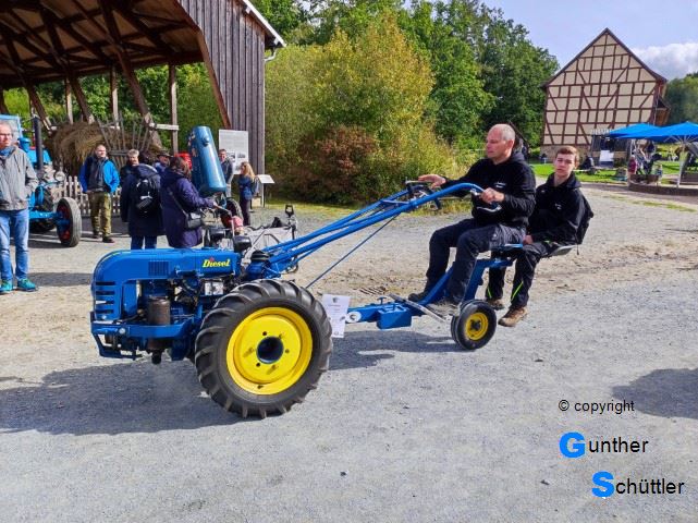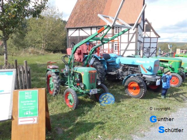 Ein herrlicher Herbsttag und ein Termin im Kalender, da lässt sich doch was machen. So entschlossen wir uns spontan zu einen Ausflug nach Neu Anspach in den Hessenpark. Ja den Entschluss sollten wir nicht bereuen. es wurde ein herrlicher Tag mit vielen Eindrücken und Gesprächen. Außer dem tollen Ambiente, verzaubert durch Schlepper und andere Oldtimer war auch eine vorzügliche Bewirtung angesagt. Teilweise erinnerte der Service an die Zeiten als die Oldie's noch jung waren. Einfach unbeschreiblich, ja wie es nur im Hessenpark vorkommt. Viele Schlepper waren angereist, teils im Originalzustand und auch welche die "überrestauriert" das Interesse der Besucher weckten.