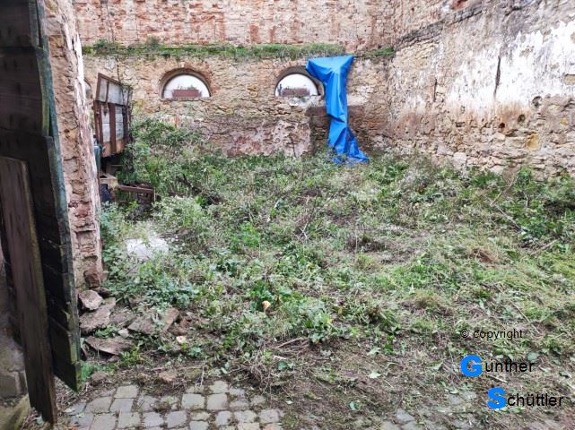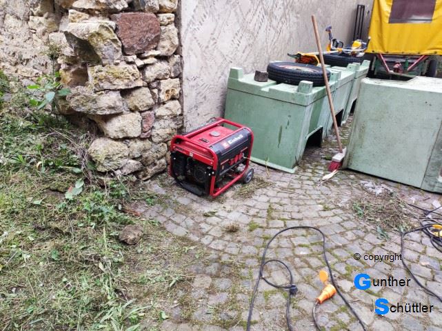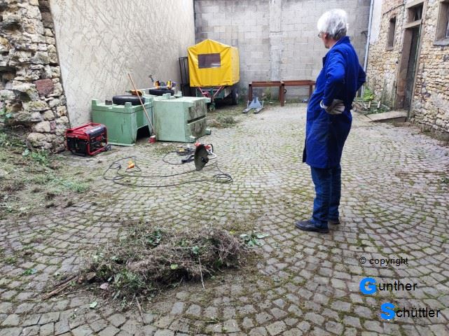 Außenbereich. In der seitlichen Abstellfläche hatten wir zwar versucht den Bewuchs einzudämmen aber der Erfolg war recht gering. Auch zwischen de Pflastersteinen wuchs jede Menge Grünzeug. Da war schon extremer Handlungsbedarf. Ein Anhänger stand in der bewachsenen Fläche und erschwerte das Mähen. | ||||