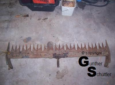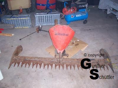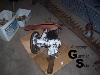 Zum Treffen brachte er die beiden Teile mit, das Parallelogram zeigte geringe Rostspuren, war wohl trocken gelagert. Bei dem Mähwerk war es etwas komplizierter, das Messer war fest, die Gummimanchette fast völlig aufgelöst und es fehlte der Anbaubock mit den Teilen zur Aushebung. Die Antriebsteile waren jedoch bis auf die Keilriemen vorhanden. Also war ein neuer Terminplan für den Winter 2009/10 notwendig. Zuerst befasste ich mich mit den vorhandenen Teilen, entlacken, entrosten, entfetten und neu lackieren.