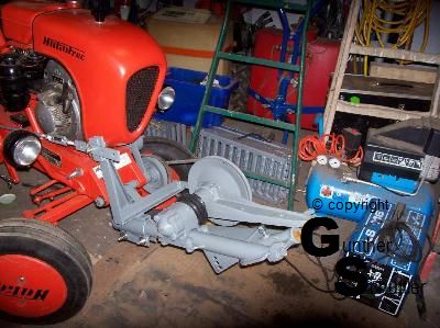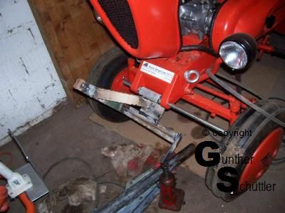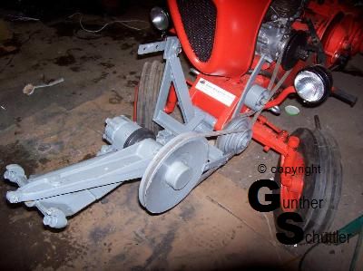 Der Antrieb hatte einen seitlichen Versatz von 45 mm, dieser rührte vom Hako Baukasten her, bei den Einachsern war der Antrieb ganz anders, er kam von einer Getriebewelle und nicht vom Motor direkt. Das gab wieder Denkanstöße die mich das System der verschiedenen Größen der Anhängekupplungen der Einachser verstehen lies. Die Klemmschelle war schnell versetzt und das Mähwerk angebaut. Es fehlten noch die Antriebskeilriemen und die Feder die bei der Geräteaushebung unterstützt. Etwas unsicher ob ich es wirklich tun sollte entriegelte ich die Aushebung und rechnete mit einem heftigen Schlag des Hebels. Dabei stellte ich fest, daß diese Feder nicht wirklich notwendig ist und lediglich dem Bediener die Arbeit angenehmer gestaltet.