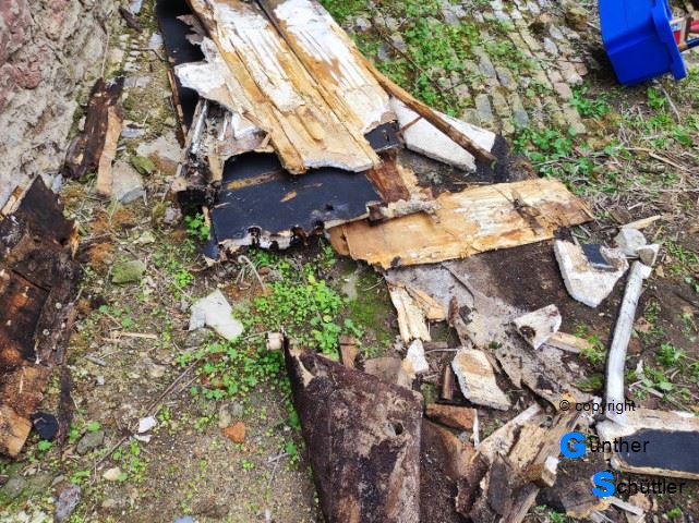 Der Boden war noch vorhanden, aber alle Hoffnungen diesen weiterhin zu verwenden waren vergebens. Der Aufbau aus dünnem Holz mit Styropor als Dämmstoff war für unsere Zwecke unbrauchbar. Leider hat sich das Holz zwischenzeitlich auch mit Wasser vollgesaugt und was damit unheimlich schwer. Also musste alles runter. Da gibt es noch einiges für die Entsorgung zu sortieren.