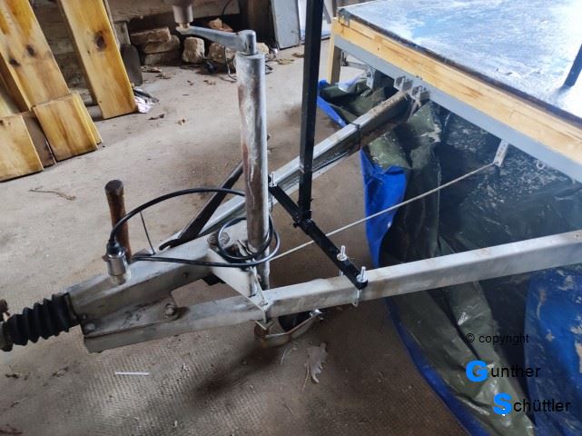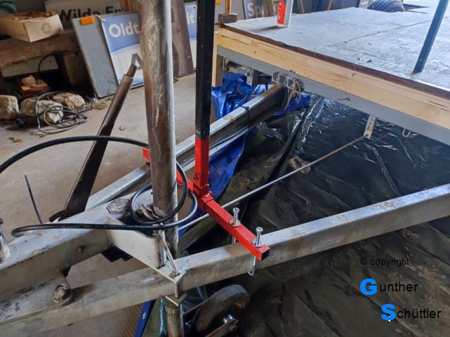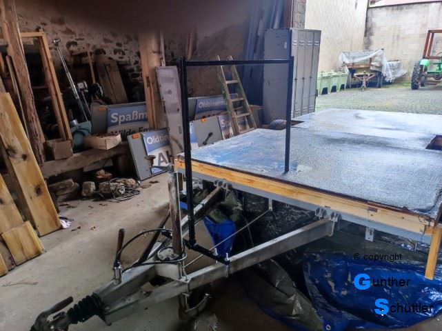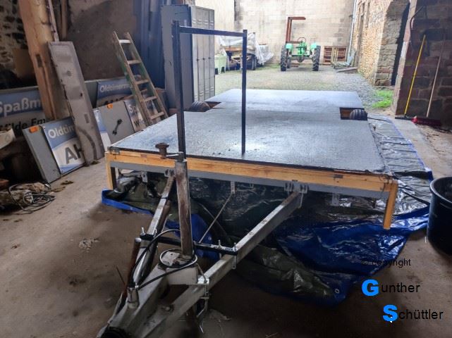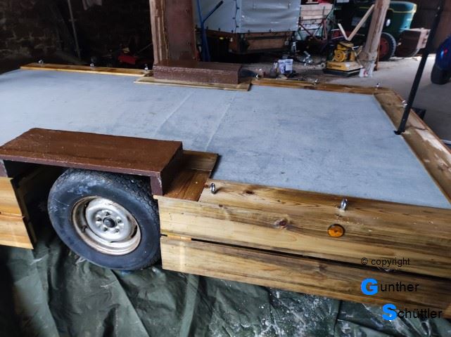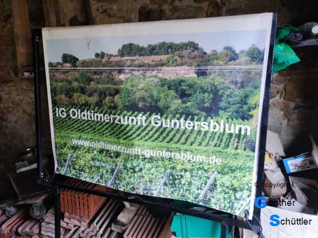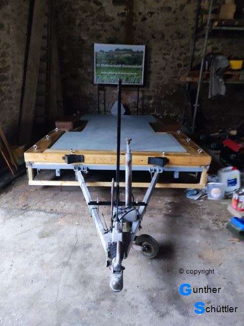 Plane mit der Aufschrift IG Oldtimerzunft Guntersblum. Diese Plane ist natürlich schnell austauschbar und der Rahmen beim Neuaufbau auch abnehmbar. Am vorderen Ende gibt es einen Rahmen der Informationen zu dem jeweiligen Ausstellungsstück bzw. dem Motto für den Festzug aufnehmen kann. Letztendlich dürfen die vorgeschriebenen Beleuchtungseinrichtungen nicht fehlen. Da wir auf öffentlichen Straßen auch noch recht langsam vorankommen wird die Rückseite noch mit dem Schild "Langsam fahrendes Fahrzeug", also das reflektierende Dreieck mit den abgeschnittenen Spitzen gekennzeichnet.