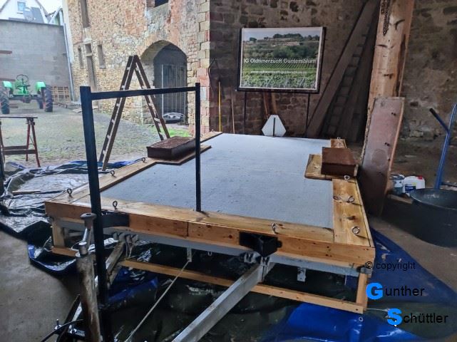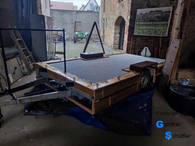 So vorbereitet und mit verschiedenen Ösen in der Umrandung ist das Fahrzeug sehr variabel für verschiedene Aufbauten vorbereitet. So ist es uns möglich flexibel auf bestimmte Festzüge einzugehen oder auch nur jährlich ein "neues Austellungsstück" aus unserem wohlgefüllten Fundus zu präsentieren. Dabei werden wir kaum Löcher in die Bodenplatte bohren müssen und damit ist dieses