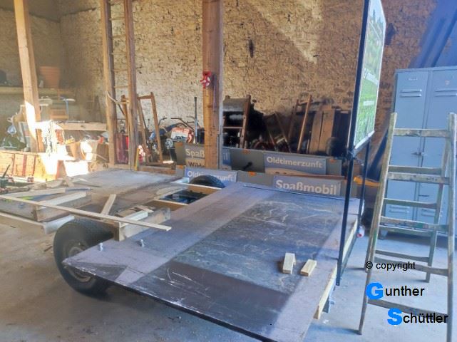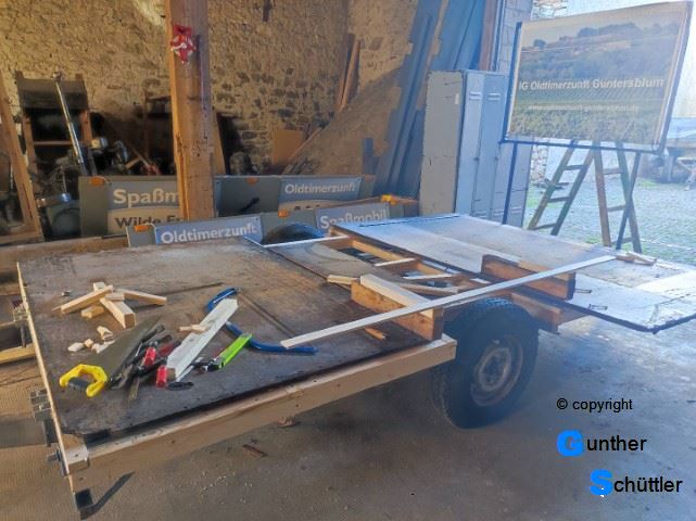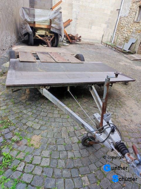 Derzeit sind 2-Kammer Lampen verbaut, eine Nachrüstung auf 3-Kammerlampen sollte kein Problem darstellen. Einzelheiten unserer Arbeiten sind unter www.oldtimerzunft-guntersblum.de/ als Projekt dokumentiert. Wir bieten den Anhänger bei Kleinanzeigen unter https://www.kleinanzeigen.de/s-anzeige/plattformanhaenger-1000kg/2507077672-220-4463 an. Wir haben viele Festzüge gefahren und hatten unsere Freude daran. Letztendlich haben wir uns gegen ein WEITER SO mit weiter steigendenn finanzellen Belastungen entschieden. Nach all den Jahren sind neue Konzepte gefragt die uns die Freude am Hobby mit den vorhandenen Maschinen und Geräten ermöglichen. Dies Konzepte haben wir in Arbeit, darin kommen auch wieder Festzüge vor. Der Hakotrac und die beschrifteten Planen werden nicht mitverkauft |