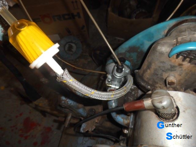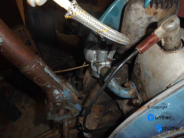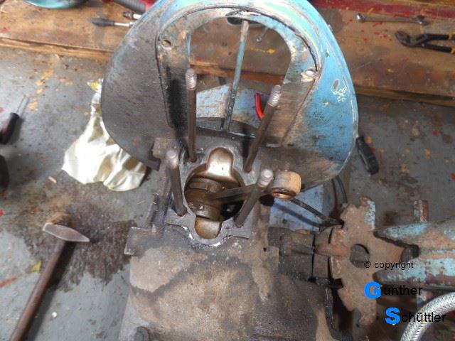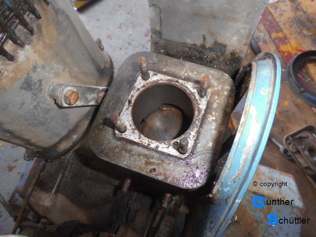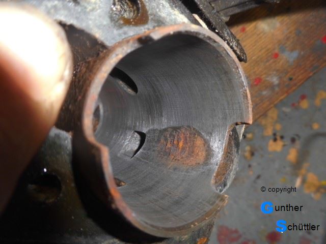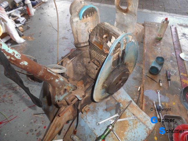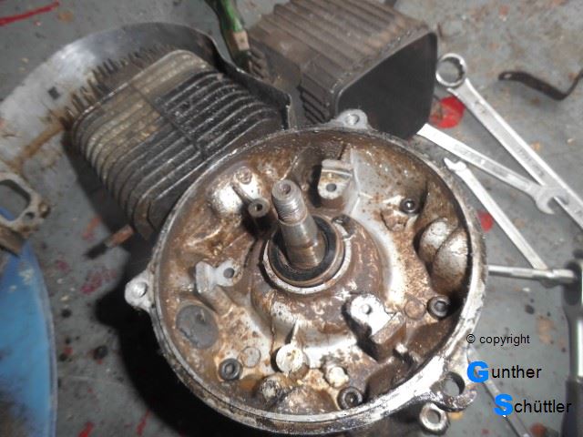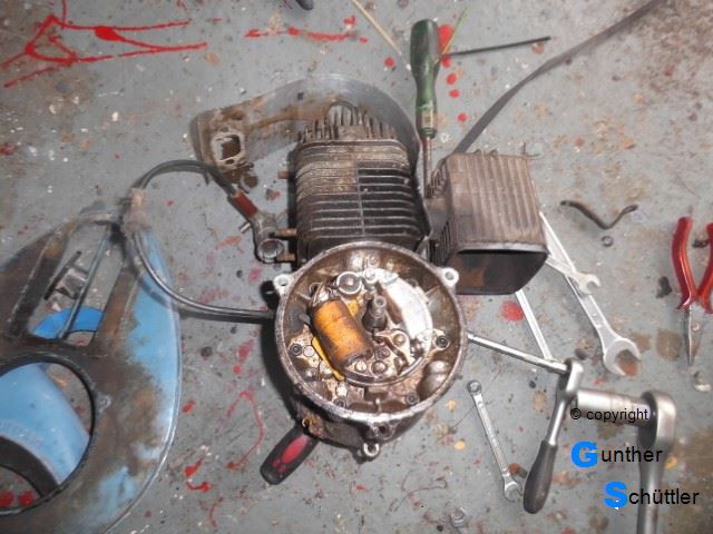 von einem inzwischen verstorbenen Nachbarn. Das ist dann noch ein Grund mehr um dieses Gerät zu kämpfen. Zwischenzeitlich stand sie ein paar Jahre in einem Garten, in dem sie auch gearbeitet hatte. Aber vor der Witterung ist ja nichts sicher.... ..... auch ist es nur schwer zu erkennen, dass da Wasser in den Motor eindringen kann. Aber davon war dann doch reichlich drin, der Motor war fest und damit sah es nicht gut aus für die SOLO. Der Motor war dann doch mit normalen Mitteln wieder frei zu bekommen, wie es im Inneren aussah kam dann später. Mit Bremsenreiniger gab der Motor ein paar Töne von sich aber danach war Schluß. Jede Menge Wasser im Kurbelgehäuse ist ja auch ein plausibler Grund dafür. | ||||