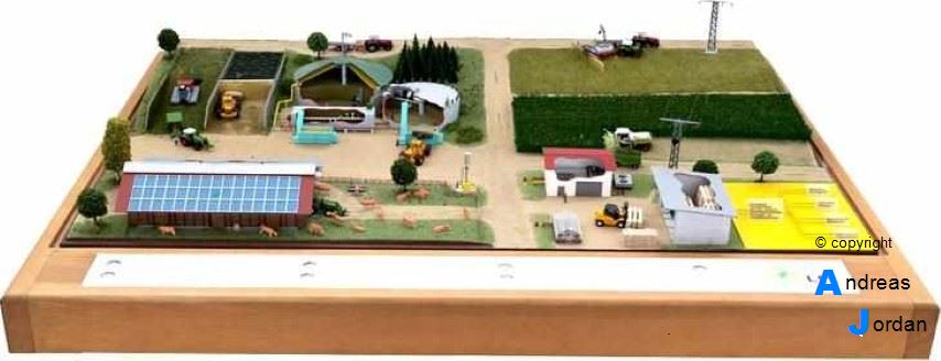 .....aber eigentlich sollte es mal was Zusammenhängendes werden. Oldtimer, Modellbau und auch Zukunftsweisendes lässt sich ja hervorragend verbinden. Modelle habe ich ja bereits, die diese Zeitspanne abdecken. Da entstand dann die Idee die Zukunft in ein Projekt zu packen. Derzeit entstehen ja viele Biogasanlagen. Zuerst ist da eine genaue Beobachtung aller Abläufe eine Notwendigkeit um eine solche Anlage als Modell abzubilden. Danach werden die Einzelteile einer solchen Anlage sowie das benötigte Material bestimmt Ja auch BIO braucht Rohstoffe, so baute ich noch einen Kuhstall und eine Mistkaute hinzu. Aus den tierichen Exkrementen (Gülle, Festmist) und den Energiepflanzen (z.B. Mais) ergibt sich die notwendige Füllmasse. eine solche Anlage. |