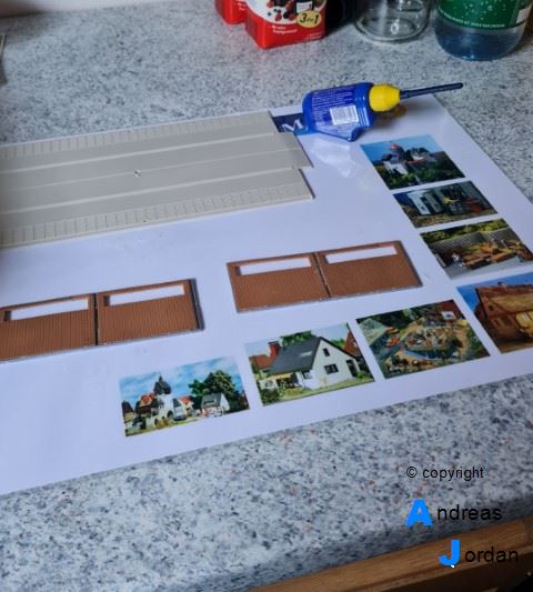 Für den Kuhstall entschied ich mich einen Fertigbausatz zu verwenden, für das Stroh nahm ich ein gelbes Papier und schob es
