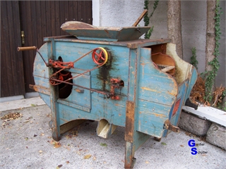 Die Frage wie soll die Maschine nach der Restauration aussehen mußte vor dem Beginn der Arbeiten geklärt werden. Dazu wurde die Windfege sorgsam untersucht, es waren Arbeiten an den Holzteilen notwendig, auch fehlten einige Siebe. Die fehlenden Siebe sind wohl mehr für die Optik, an der Windfege war ursprünglich ein Gestell in dem zusätzliche Siebe ihren Platz fanden. Dieses Gestell war nur noch zu erahnen. Aber es sollte sich rekonstruieren lassen.