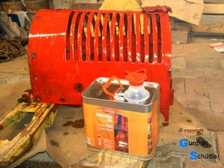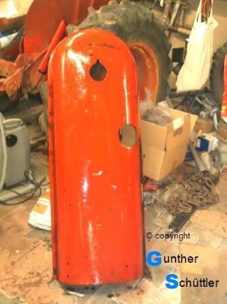 Der 2. Versuch war dann eine ähnliche Farbe anzumischen und eine Fläche für die neue Beschriftung zu lackieren. Etwas Rostspray wirkte wie ein Wunder. Nach dieser Methode wurden noch weitere Teile behandelt. Es sollte ja kein schreiender Unterschied sein, aber die Narben des langen Schlepperlebens dürfen durchaus sichtbar bleiben.