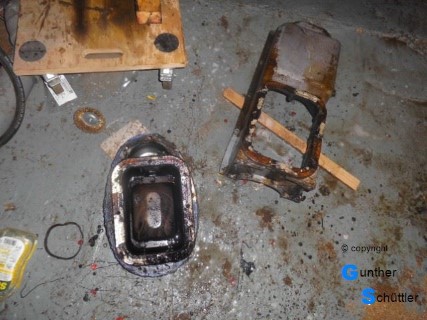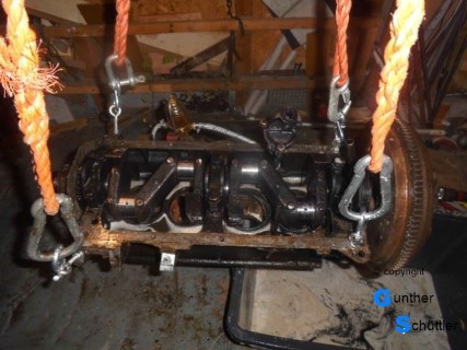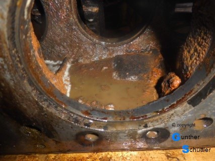 Aber es kam dann doch noch anders. Der Motorblock war dermaßen verschmutzt, dass eine normale Reinigung nicht den gewünschten Erfolg bringen würde. So nahm ich erst einmal den ganzen Schmoder aus dem Kühlwasserbereich raus und versuchte diesen mit einer Messingbürste zu reinigen. Danach war es jedoch nur geringfügig weniger Schmutz und der musste natürlich weg. Half nur die Reinigung mit etwas Druck. Den Motor am Frontlader aufhängen, ein rechteckigen Speiskübel darunter und dann mit Reiniger und reichlich Wasser ausspülen. Das Schmutzwasser wird aufgefangen, damit es nicht in die Umwelt gelangt. Um das Wasser zu entfernen wird der Motorblock in alle Richtungen gedreht und danach mit WD40 zum Schutz vor Korrosion behandelt.