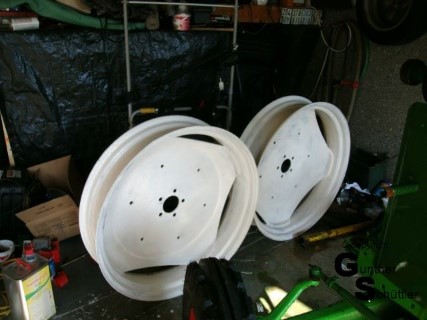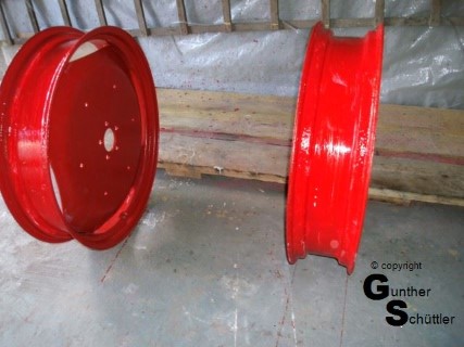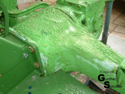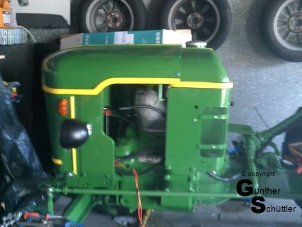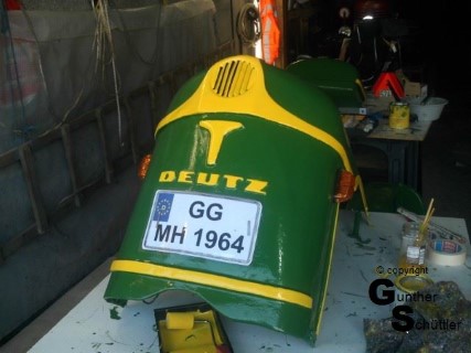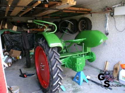 Was das Ganze auch noch langwierig macht sind die Mischungen aus lackierten Teilen und den mit Farbe misshandelten Teilen, so ist nur Stück für Stück voranzukommen. Beim Zerlegen fielen dann auch Teile auseinander, beim näheren Hinsehen waren Schnitte mit der Trennscheibe sichtbar, an der Stelle hätte auch etwas mechanischen Grundverständnis einiges Unheil vermieden. Als an den von der Farbe befreiten Teilen das Metall sichtbar wurde war es dann Zeit die Beschichtung beginnend mit der Grundierung aufzubringen. Ein gutes Gefühl stellte sich ein als der hintere Teil in Deutzgrün (RAL 6002) erstrahlte. Mit dem vorderen Teil wurde ebenso verfahren und ausgeschlagene Buchsen ausgetauscht. Für die Hauben und Tank war der Aufwand etwas höher, fillern und schleifen ist schon aufwendig. Die Lackierung sollte eines historischen Schleppers würdig sein, so arbeiteten wir mit der Schaumstoffwalze. Das Ergebnis ist keine Lackierung nach Art des heutigen Automobils sondern es erinnert an die Schlepper der 50er Jahre. Auch sollten nicht alle Gebrauchsspuren verschwinden, da diese ja die Seele des Fahrzeugs sind. Es ist ein richtiges Bündel Vergangenheit auf dem Weg in die Zukunft, Viel Arbeit und Diskussionen pflasterten den Weg, aber es hat sich gelohnt.