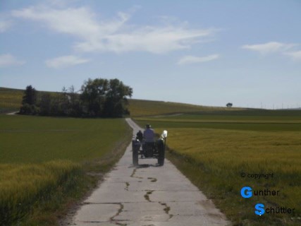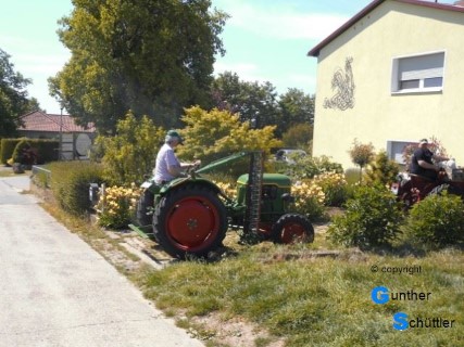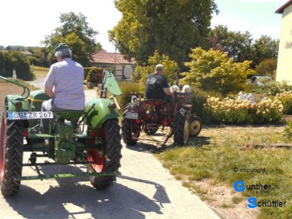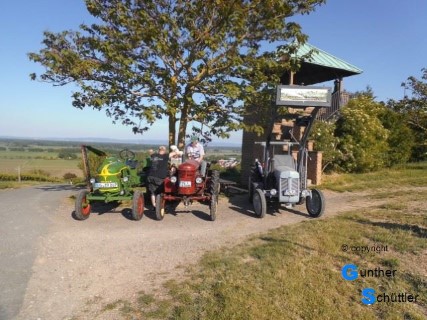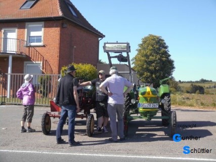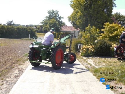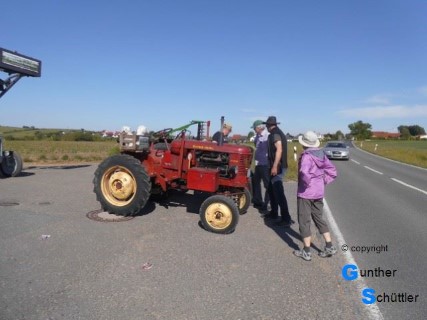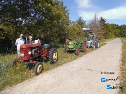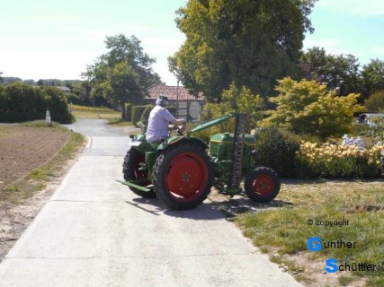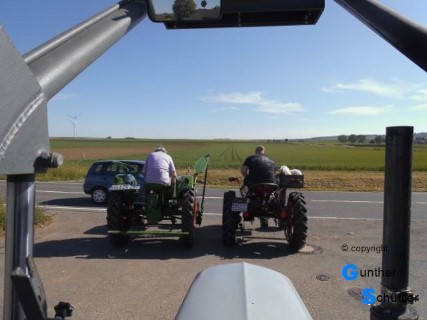Einen Zwischenstopp legten wir bei Hartmut ein und bewunderten ausgiebig seine Einrichtung. Dann hielt uns aber nichts mehr und wir fuhren weiter. Die nächste Überraschung war dann der Besuch bei einem Oldtimerfreund in Dolgesheim und dort bestaunten wir dann einen Normag und einen von 88 Stück gebauten Opel Corsa A Spider. Wir waren begeistert. Wir sind dann weitergefahren und haben nochmals einen Zwischenstopp eingelegt, weil Hartmut und ich die Trecker getauscht haben. Auch hier haben wir ein sehr schönes Erlebnis gehabt, denn es kam ein Bekannter von Gunter mit einem Jeep Willis. zufällig vorbei der sich unsere Oldtimer anschauen wollte. Nachdem wir uns verabschiedet hatten fuhren wir wieder Richtung Heimat. Wir hatten einen schönen Tag und die Technik hat durchgehalten. Wir werden so einen schönen Ausflug bestimmt wieder machen.