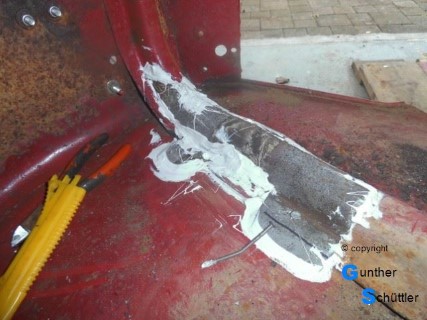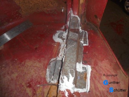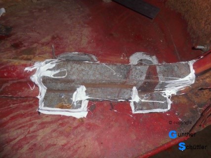 Das Verschliessen der Löcher war da schon aufwändiger, die Bleche mussten recht genau eingepasst und fixiert werden. Hinzu kam dann auch noch, dass sich die Verstrebung etwas aus ihrer Position entfernt hatte. Letztendlich geschah die Fixierung dann noch durch 4 Schrauben, die Schraubenköpfe kann die Patina verkraften.
