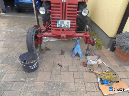 Der IHC hat sicher schon schlechtere Zeiten in seinem Arbeitsleben gesehen. Deutliche Spuren zeigten sich an der Vorderachse. Als erstes sah man die freien Stellen oberhalb der Lagerung an den Achsschenkeln. Es sah nach ermüdeten Federn aus. Also hilft nichts die Achsschenkel müssen raus um die Federn zu tauschen. Der Ausbau zeigte sich schwierig, Weder Lenkhebel noch Lenkeinschlag waren mit dem Abzieher zur Aufgabe zu bewegen. Letztendlich half nur die Kraft des Feuers, die leider verbrannte Teile hinterlies, die kann man in den Fotos auch leicht erkennen.