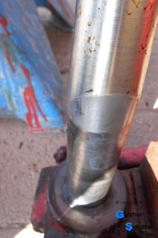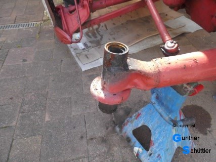Aber leider war es auf der linken Seite nicht so einfach. Die obere Buchse war eine dünnwandige Bronzebuchse, es bestand die Möglichkeit, dass der Rest des Durchmessers mit einer Stahlbuchse ausgekleidet war. Aber alle Versuche waren vergebens. Auch Nachforschungen ob es diese Achse mal mit dünneren Buchsen gegeben hat verliefen im Sand.