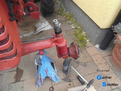 Als endlich alle Teile da waren und es weitergehen konnte war zuerst die rechte Seite angesagt. Auf dieser Seite war im oberen Bereich eine dickwandige Buchse aus Kupfer verbaut (bestimmt nicht original) ja und die untere Buchse war ja zerfallen. Die neuen Vulkollan Buchsen passten traumhaft gut und somit war diese Seite auch schnell abgehandelt. Kotflügeln usw. vom alten Achsschenkel umsetzen und das Rad montieren und das war es dann auf dieser Seite.