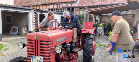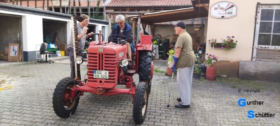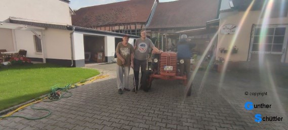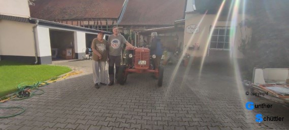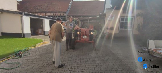 So fahr der Bursche dann über den Rhein zu seinem heimischen Stellplatz. Da sah man dann erfreute Gesichter, der Besitzer und sein Vater erfreuten sich an dieser Maschine. In dem historisch gewachsenen Hof fühlt es sich bestimmt auch wohler wie vor einer Werkstatt.