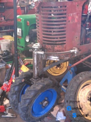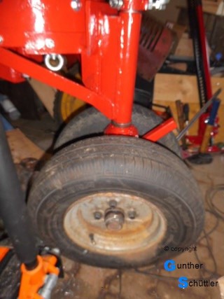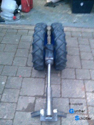 Endlose Diskussionen und doch kreatives miteinander brachten verschiedene Vorgehensweise und Ausführungen zum Vorschein. Ein einziges Rad unterhalb des Kühlers war der Favorit, ja es gibt Räder aber nicht in der Größe die optisch auch was hergeben. Der nächste Ansatz war dann in welcher Größe gibt es Frontreifen, alle anderen Reifenformen sehen da nicht wirklich gut aus. Letztendlich fanden sich Frontreifen der Größe 4.00-12 wie sie auf Hakos, Solos usw. zu finden sind. Felgen sind noch da also los gehts. Erst wird die originale Achse ausgebaut und aufbewahrt, Ponyteile sind rar. Ein Grundsatz sollte sich durch die Arbeit ziehen, es wird nichts verändert, was ein Rückbau verhindert.