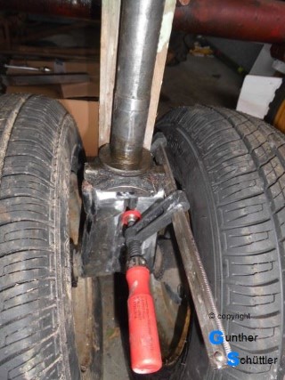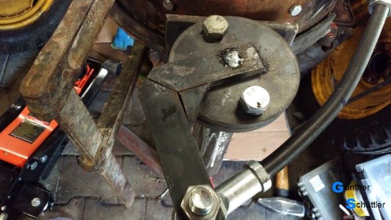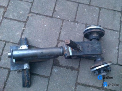 .....wenn Löcher und Lochkreis stimmen. Und die haben gepasst, lediglich die Mittelbohrung der Solo Felge musste angepasst werden. Nachdem die theoretischen Vorbereitungen abgeschlossen waren kamen Flex und Schweißgerät zum Einsatz, Teile von der Anhängerachse abtrennen und zu der gewünschten Vorderachse zusammenfügen. Theoretisch muss das jetzt passen. Auf den Felgen waren noch die AS Profilreifen und die griffen unten wie Zahnräder ineinander. Nein das war nicht schön. Die Felgen drehen brachte dann einen erhöhten Abstand aber die Optik, nein die gefiel mir nicht. Auch der Gedanke an die Reifenfüllung war nicht berauschend. Ok 2x10mm Spurverbreiterung war die Lösung. Den ganzen Vorbau zusammengestellt, Welle, Rohre, Lager, Lenkstange, Umlenkhebel und was sonst noch notwendig war galt es einzukaufen. Zusammenheften und teilweise auch das Wort Holzmodell mit Leben zu erfüllen waren Stationen auf dem Weg zu dieser Vorderachse. Nachdem die Teile zusammengeheftet waren wurden sie von Hartmut dann verschweißt, bevor ich sie grundierte und einbaute.