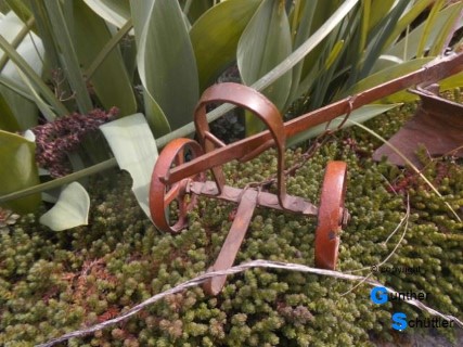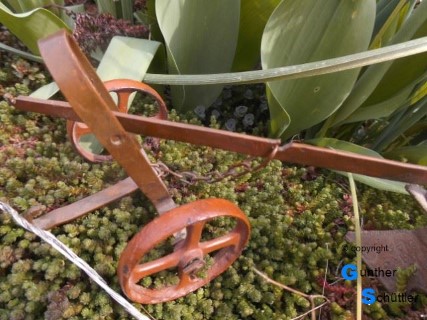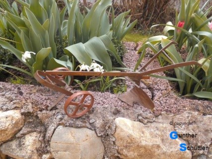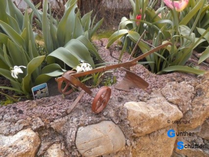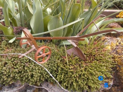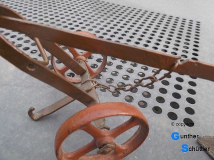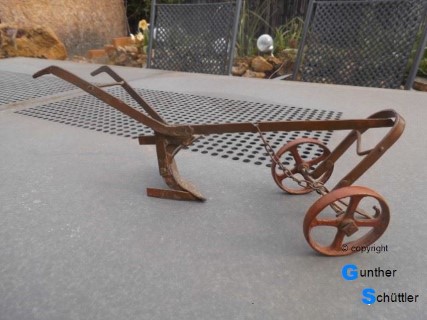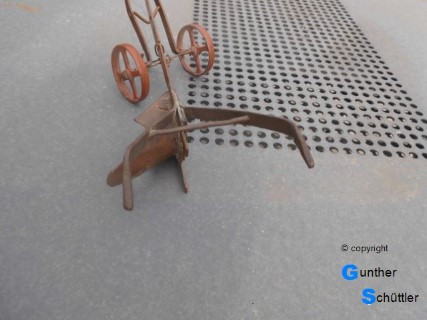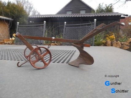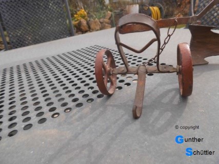Das handwerkliche war schon da aber eben noch verbesserungswürdig, dazu kamen neue Kenntnisse im elektrischen Bereich durch das Fach Experimentieren. Angekündigte Experimente für die nächste Woche versuchte ich mit meinen bescheidenen Mitteln vorher selbst aufzubauen, meist fehlte es an der Funktion aber der Weg war richtig. Weiterhin wurden im Ort die Freileitungen des Stromnetzes erneuert, es gab den einen oder anderen Kupferrest als Abfall. Damit wurde die Zeit reif sich wieder an die Wicklungen aus Kupfer zu erinnern. Es gab für mich dann verschiedene Dinge, es entstanden einige meiner "Kunstwerke", aber eben nichts von Dauer. Im Jahr 1967 kam dann in Experimentieren die Versuche mit der Galvanik. Ja so lässt sich doch ein Pflug aus diesen Wicklungen bauen, das Pflugschar dann aus Stahlblech und eben verkupfern. Über einen Mangel an Unterstützung konnte ich mich nicht beklagen, mein Bruder brachte Kupferreste nach Hause, mein Vater förderte mich fachlich und unser Schulrektor Herr Horn schaffte die theoretischen Grundlagen für die Galvanik und begleitete Misserfolge und den Erfolg. Es war dann einiges zu verformen, mit kleinerem Werkzeug auf dem Amboss und im Schraubstock bis der Rahmen fertig war, alles mit Nieten aus den Kupferresten verbunden. Nun kam das Schar, ja das Metall musste blank sein. Verzinktes Blech bot sich an. Das Salz für den Elektrolyt stammte aus Restbeständen von früheren Pflanzenschutzmaßnahmen im Weinbau. Als Stromquelle diente das Baterieladegerät. Es dauerte Tage bis sich eine dicke Kupferschicht bildete, eine tolle Erfahrung und schön anzusehen. Aber leider zeigte sich bei dem vernieten, dass diese Schicht sich ablöste. Zusammen mit Herrn Horn fand dann die Untersuchung statt...... ....es war nicht die Kupferschicht, nein die Zinkschicht löste sich. Verzinktes Blech war also ungeeignet. Jetzt das Ganze mit gereinigtem Schwarzblech und der Erfolg stellte sich ein. Die Räder für den Vorderpflug stammten von unserem alten Schaukelpferd, ja die Farbe hat einigermassen gepasst und wunde auch nicht angepasst. Als Alles fertig war schleppte ich den Pflug mit in die Schule, Herr Horn holte den Schlüssel der Vitrine und mein Pflug blieb bis zum Abschluß der Schule als Ausstellungsstück in der Schule. Anschliessend fand er bei uns einen Platz auf dem Fernseher bis sich einige Nietverbindungen auflösten. Meine Mutter bewahrte die Einzelteile sorgfälltig auf. Als ich dann nach meinen beruflichen Umtrieben sesshaft wurde übergab sie mir diese. Um nichts zu verändern stabilisierte ich dann die Verbindungen mit Klebstoff. Heute habe ich den Pflug immer noch auch als Erinnerung an meine Eltern und den Schulrektor die nur noch in der Erinnerung weiterleben. Modellbau